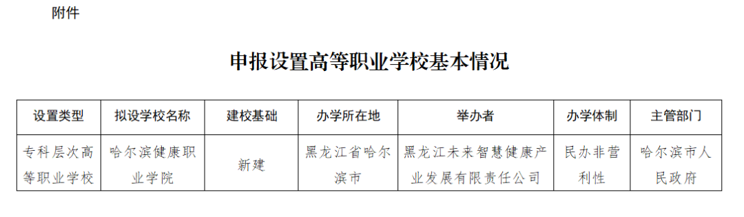 公示信息显示,哈尔滨健康职业学院为新建民办专科层次高等职业学校,举办者为黑龙江未来智慧健康产业发展有限责任公司。