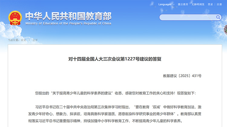 近日,教育部网站公布《对十四届全国人大三次会议第1227号建议的答复》,对“关于提高青少年儿童的科学素养的建议”做出答复。