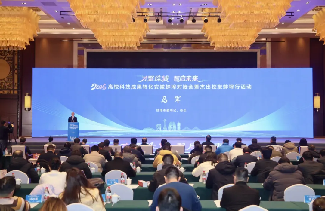 才聚珠城,智启未来。1月10日至11日,2026高校科技成果转化安徽蚌埠对接会暨杰出校友蚌埠行活动举行。市委书记、市长马军,中国高等教育学会副会长葛道凯,安徽财经大学党委副书记、校长吴华清分别致辞。蚌埠医科大学党委常委、副校长刘浩,安徽科技学院党委委员、副院长方鸣,蚌埠学院党委委员、副院长郭有强,蚌埠工商学院副校长汪时珍,安徽电子信息职业技术学院党委委员、副院长闻学;市领导张晓静、汪安定、金胜庆;170余名来自全国各地高校院所的科研管理、成果转化部门负责人和蚌埠杰出校友等出席相关活动。