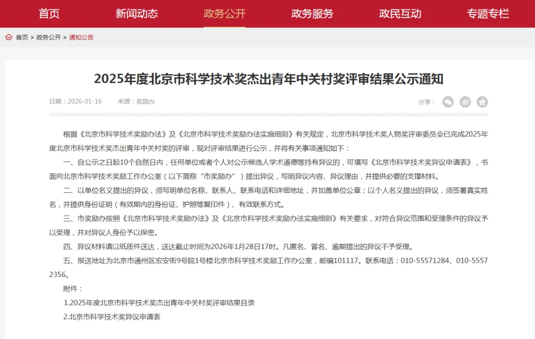 日前,北京市科学技术委员会、中关村科技园区管理委员会官网发布了《2025年度北京市科学技术奖杰出青年中关村奖评审结果公示通知》。
