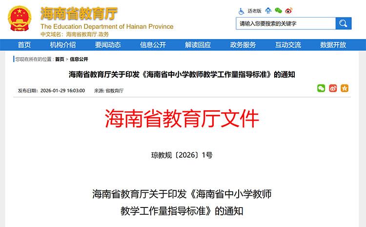 近日,海南省教育厅印发《海南省中小学教师教学工作量指导标准》(以下简称《指导标准》),进一步规范课时基准,保障开齐开足课程。