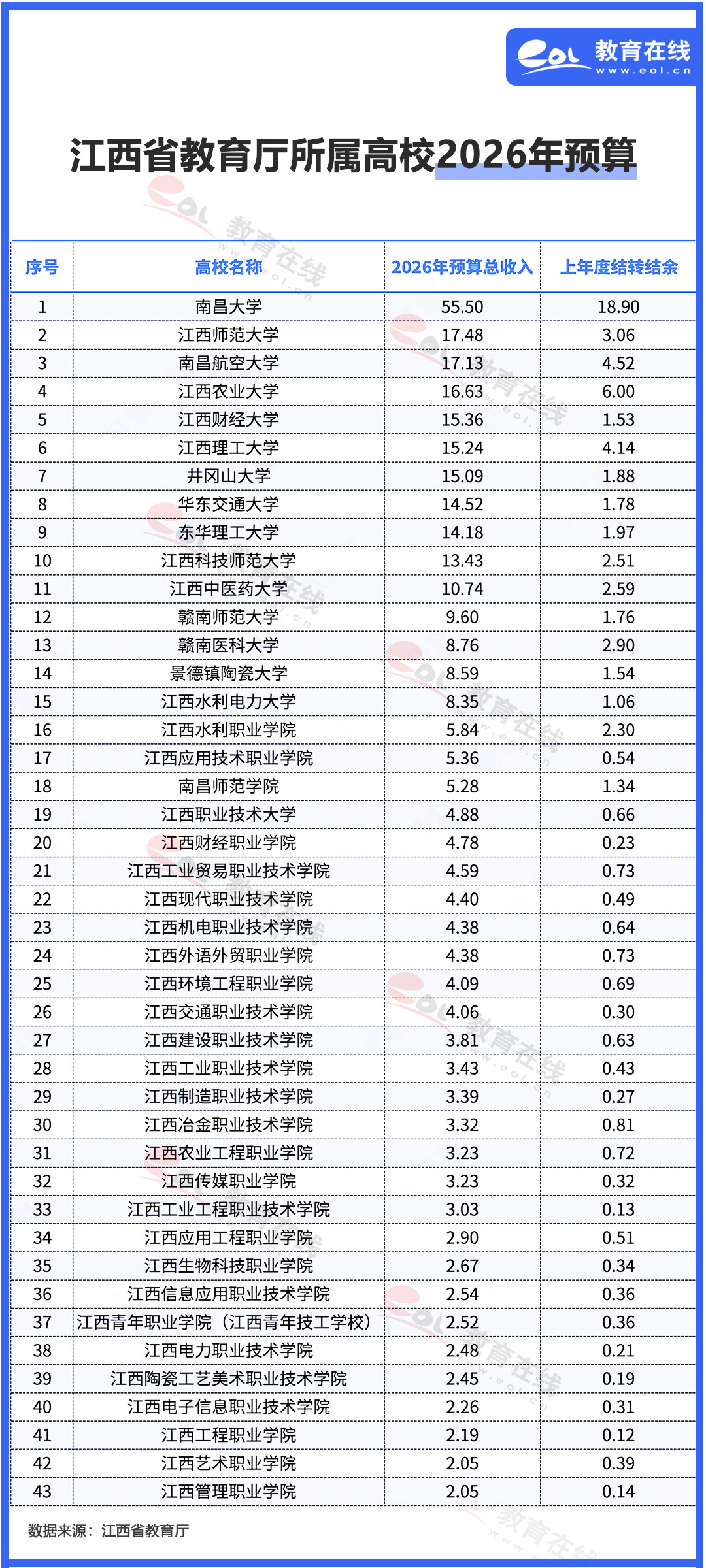 近日,江西省教育厅公布了2026年所属单位预算信息,其中包含了43所高校。