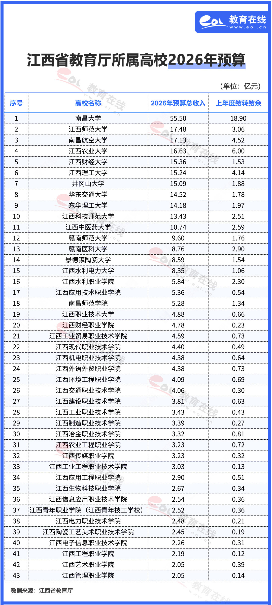 江西省教育厅所属高校2026年预算公布:南昌大学55.5亿居首