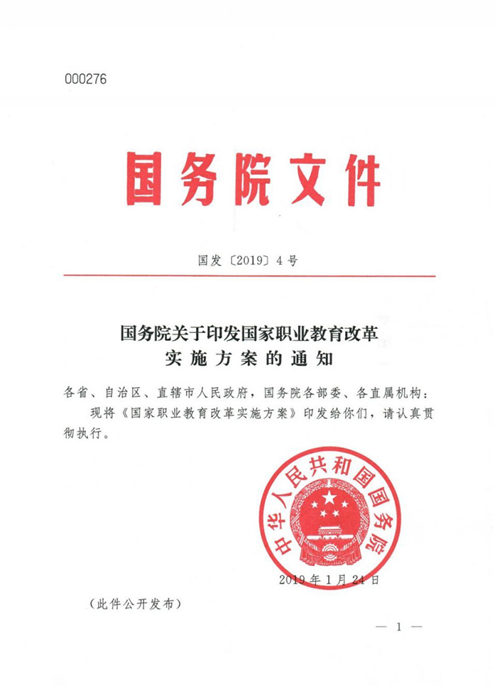 近日,国务院印发《国家职业教育改革实施方案》。《方案》提出,从2019年开始,在职业院校、应用型本科高校启动“学历证书+若干职业技能等级证书”制度试点工作。到2022年,职业院校教学条件基本达标,一大批普通本科高等学校向应用型转变。经过5-10年左右时间,职业教育基本完成由政府举办为主向政府统筹管理、社会多元办学的格局转变,由追求规模扩张向提高质量转变,由参照普通教育办学模式向企业社会参与、专业特色鲜明的类型教育转变,大幅提升新时代职业教育现代化水平,为促进经济社会发展和提高国家竞争力提供优质人才资源支撑。