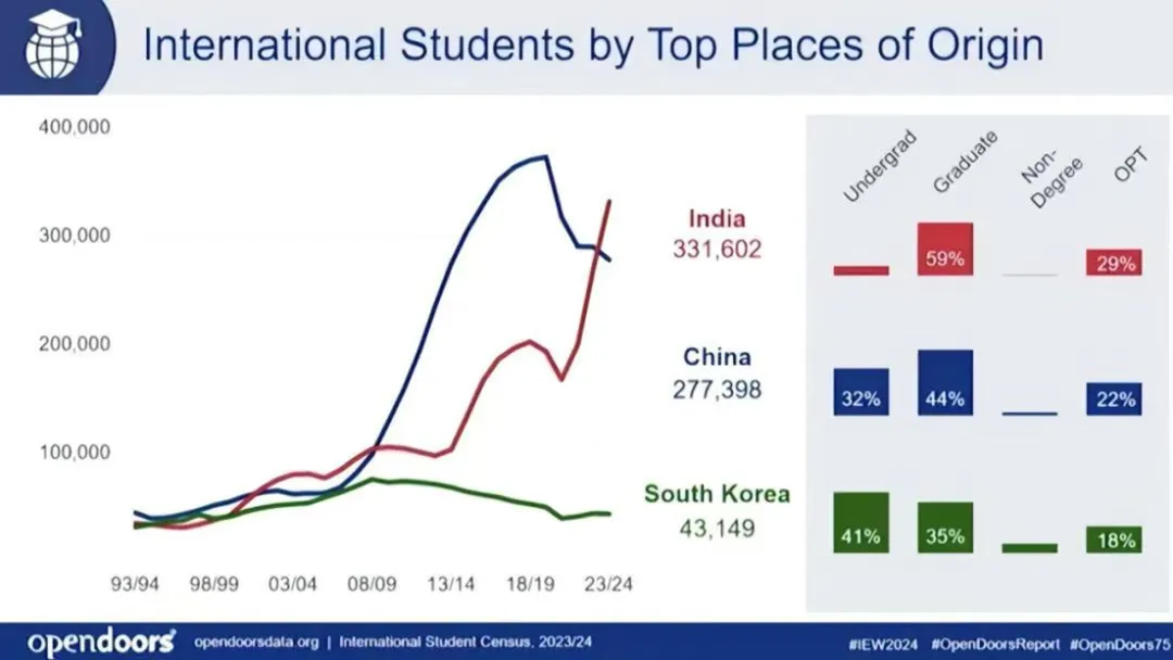 △美国门户开放报告显示,印度赴美留学人数已超越中国