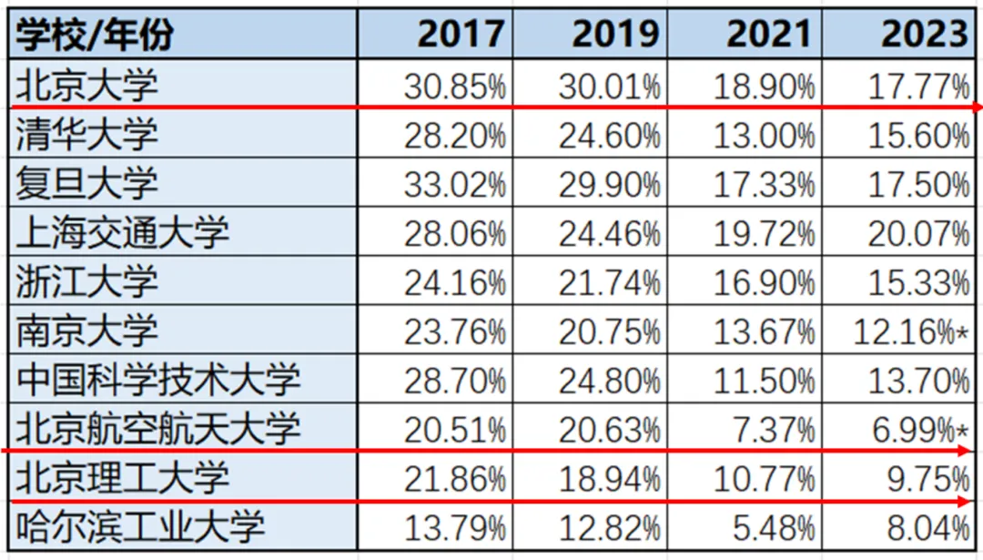 因此,国内理工科为主的著名高校本科出国受阻。清华大学本科毕业生出国比例从2017年的28.2%跌至前些年的13%-14%,而国防七子院校因为学校性质影响更大,本科出国留学跌去2/3。与此相对应,北大复旦等高校则因人文社科专业不受影响,本科出国仅下降1/3。