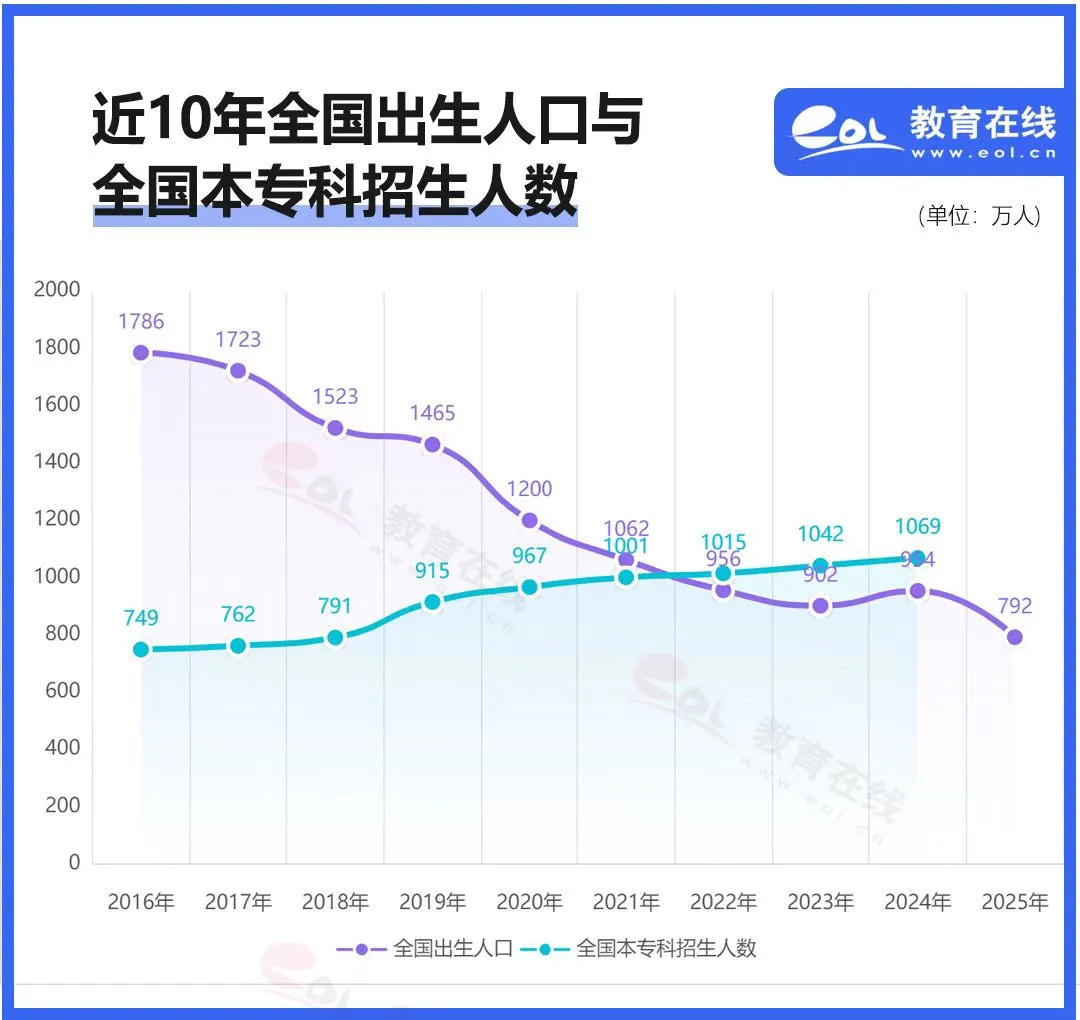 新生儿从2016年的1786万快速下降至2025年的792万,8年跌去56%。2024年全国高校招生1069万,如果加上专升本,中职直升高职的人数,则超过了1200万。包括大学在内,未来教育资源必然显著过剩,直白讲,就是没有生源了。这还是在二孩三孩政策不断刺激下的结果。悲观的人口专家比如梁建章估计,未来长期可能低于700万。