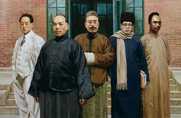 陈丹青油画作品《国学研究院》。从左到右分别为赵元任、梁启超、王国维、陈寅恪、吴宓。
