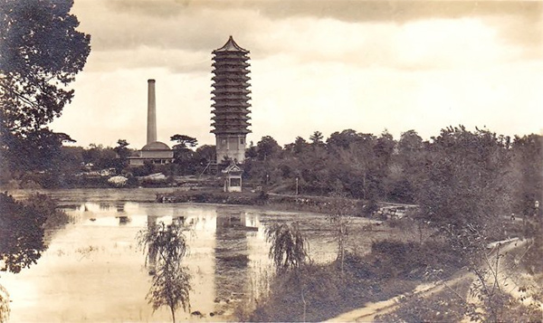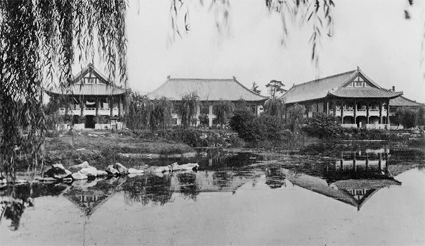 1937,燕京大學校園-貝公樓(巴什福德廰)、華表和方院。