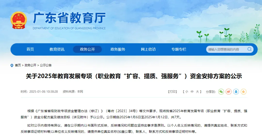 1月6日,广东省教育厅公示了2025年教育发展专项(职业教育“扩容、提质、强服务”)资金安排方案,拟安排4.6亿元支持59所高职院校与9个地市的中职教育发展。公示期自2025年1月6日至2025年1月12日。