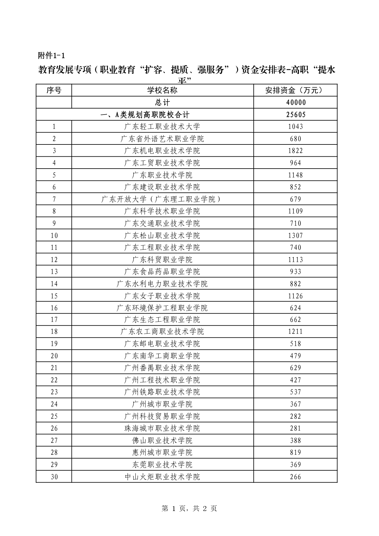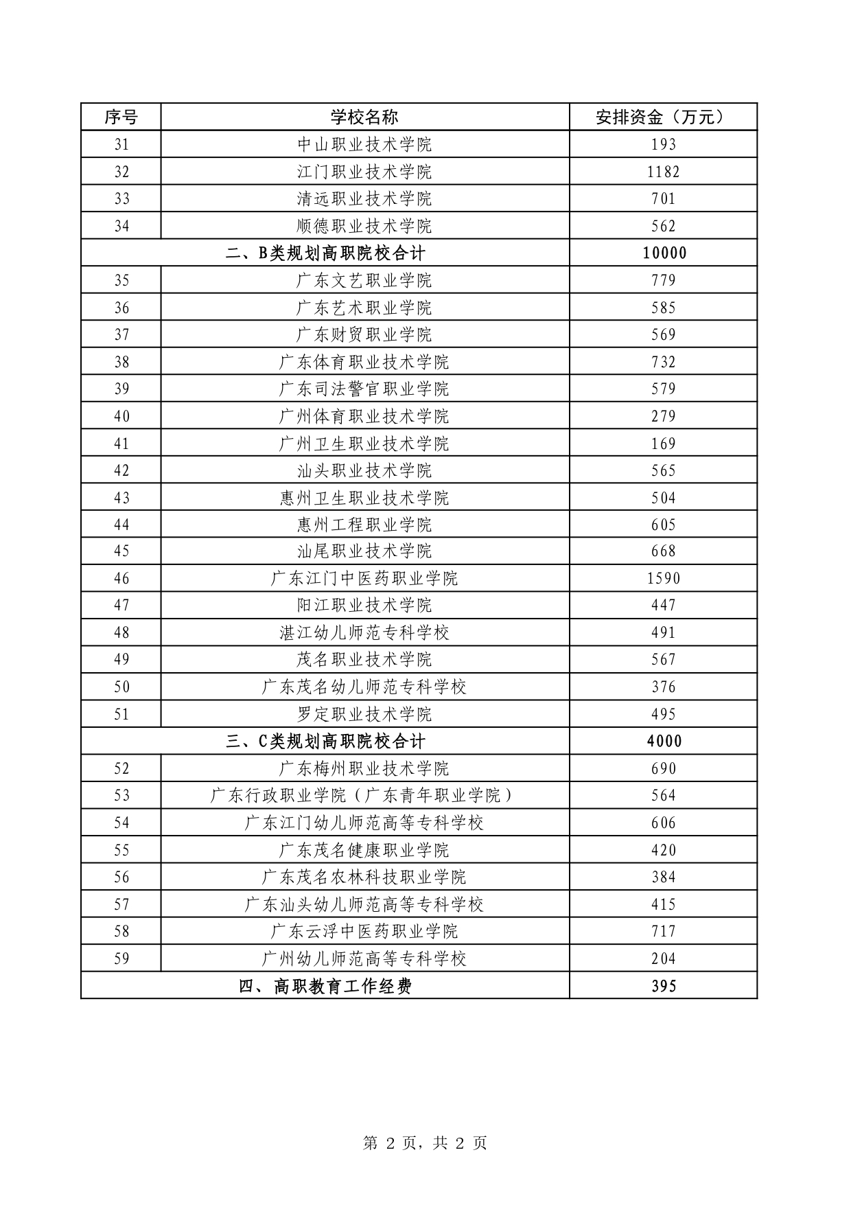 资金安排方案中,高职“提水平”资金总计拟安排4亿元,涵盖59所高职院校。其中34所A类规划高职院校合计拟安排25605万元,17所B类规划高职院校合计10000万元,8所C类规划高职院校合计拟安排4000万元,另有395万元的高职教育工作经费。
