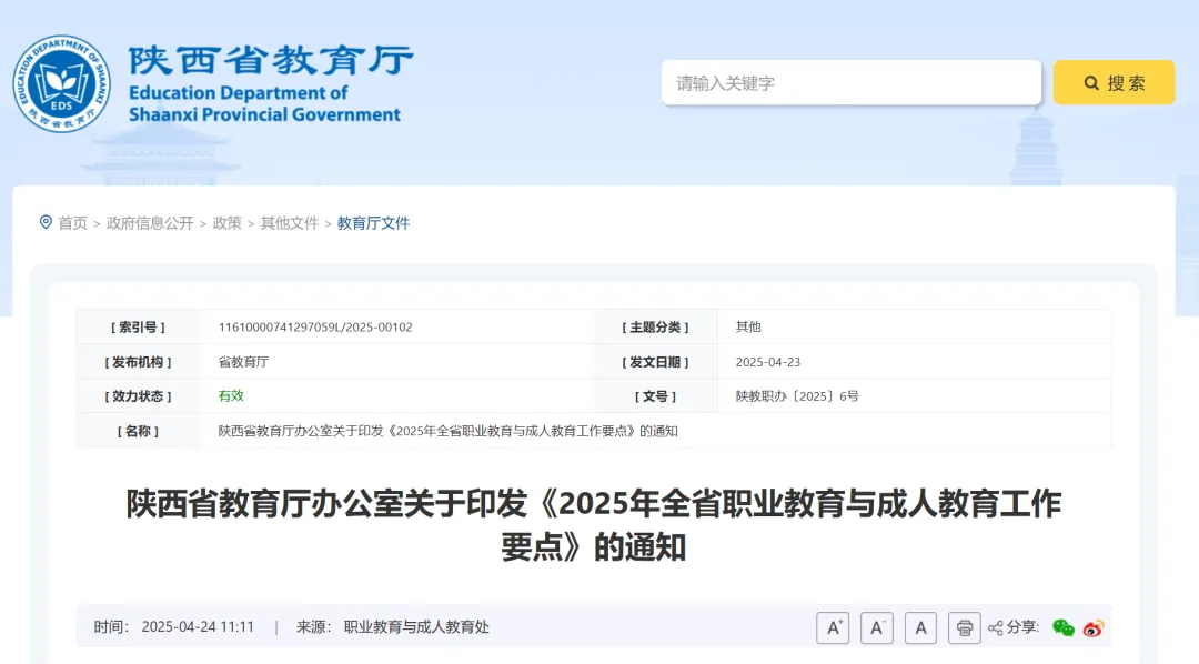 近日,陕西省教育厅印发《2025年全省职业教育与成人教育工作要点》。要点明确,优化专业设置方面,将优先设置急需专业,全面清理停办专业。推进职普教育学籍互转、课程互选、学分互认等。面向中亚地区建设一批“秦岭工坊”,打造陕西“职教出海”国际品牌。