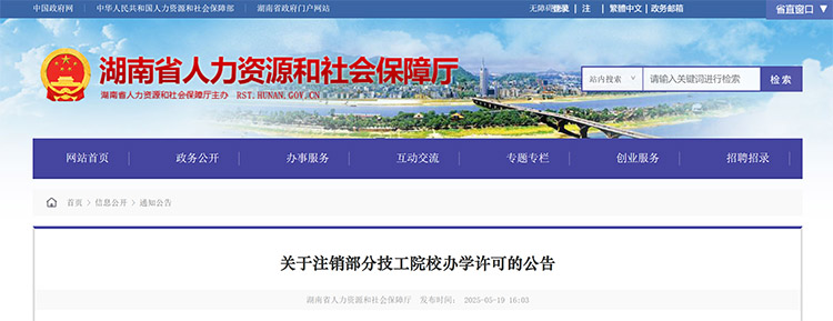 5月19日,湖南省人力资源和社会保障厅发布《关于注销部分技工院校办学许可的公告》。2025年3月10日—18日,长沙市人社局对辖区内的湖南省工程高级技工学校、湖南省交通高级技工学校等19所连续三年以上未招生办学、长期处于停滞状态的技工院校注销办学许可事项进行了公示,未收到任何异议。根据相关规定,湖南省人力资源和社会保障厅对19所技工院校注销办学许可。
