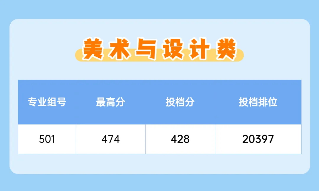 美术类专业组最高投档分为474分,最低投档分为428分。其中,数字媒体艺术设计专业为新增专业,今年首次招生就备受考生欢迎,最低投档分为441分。