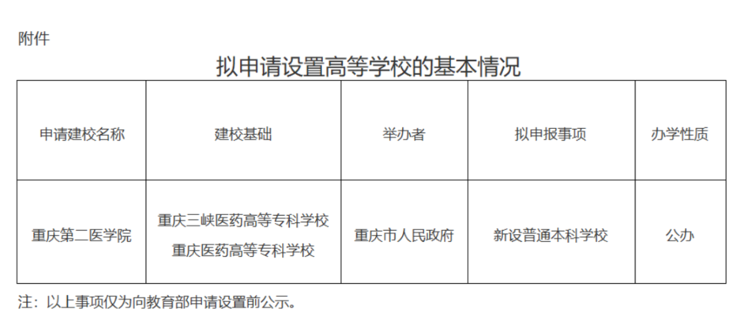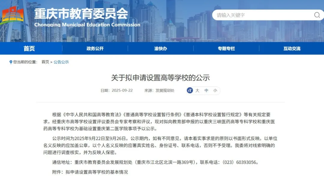 9月22日,重庆市教育委员会发布《关于拟申请设置高等学校的公示》,根据《中华人民共和国高等教育法》《普通高等学校设置暂行条例》《普通本科学校设置暂行规定》等有关规定要求,经重庆市高等学校设置评议委员会专家考察和评议,现对拟向教育部申报的以重庆三峡医药高等专科学校和重庆医药高等专科学校为基础设置重庆第二医学院事项予以公示。