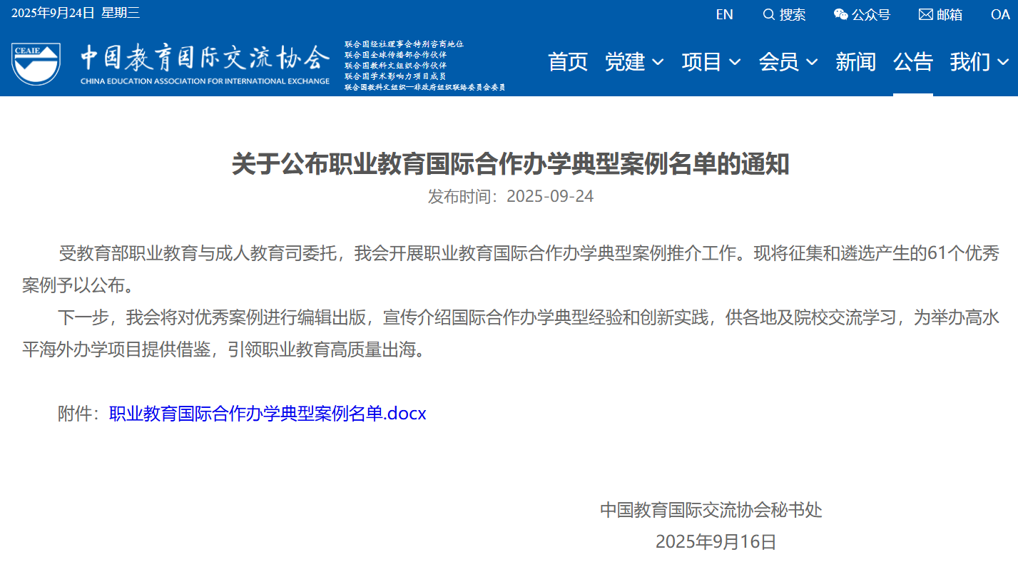 9月24日,中国教育国际交流协会发布《关于公布职业教育国际合作办学典型案例名单的通知》,受教育部职业教育与成人教育司委托,中国教育国际交流协会开展职业教育国际合作办学典型案例推介工作。现将征集和遴选产生的61个优秀案例予以公布。根据名单,全国共有52所高职院校入选。