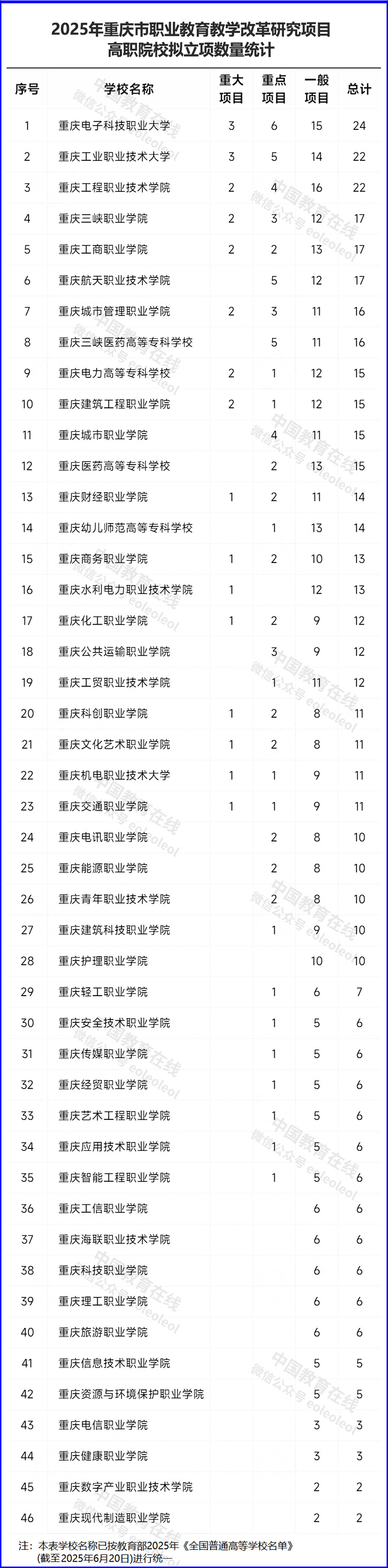10月27日,重庆市教育委员会发布《2025年重庆市职业教育教学改革研究项目拟立项名单公示》。根据相关文件要求,经个人申报、学校推荐、专家评审推荐,2025年度拟立项职业教育教学改革研究项目652项,其中重大项目38项、重点项目93项、一般项目521项。