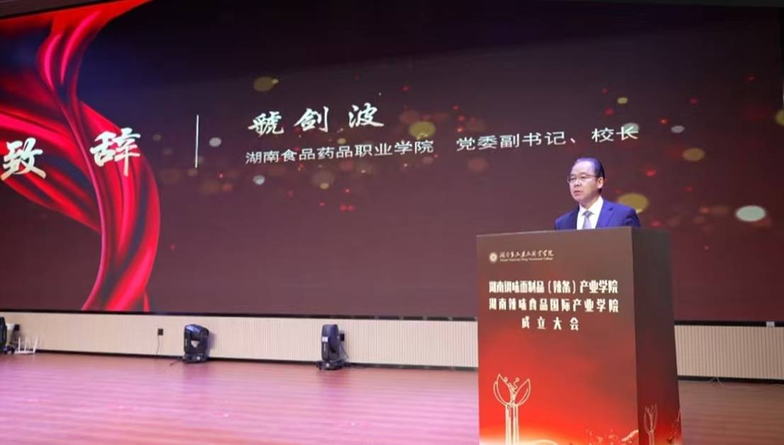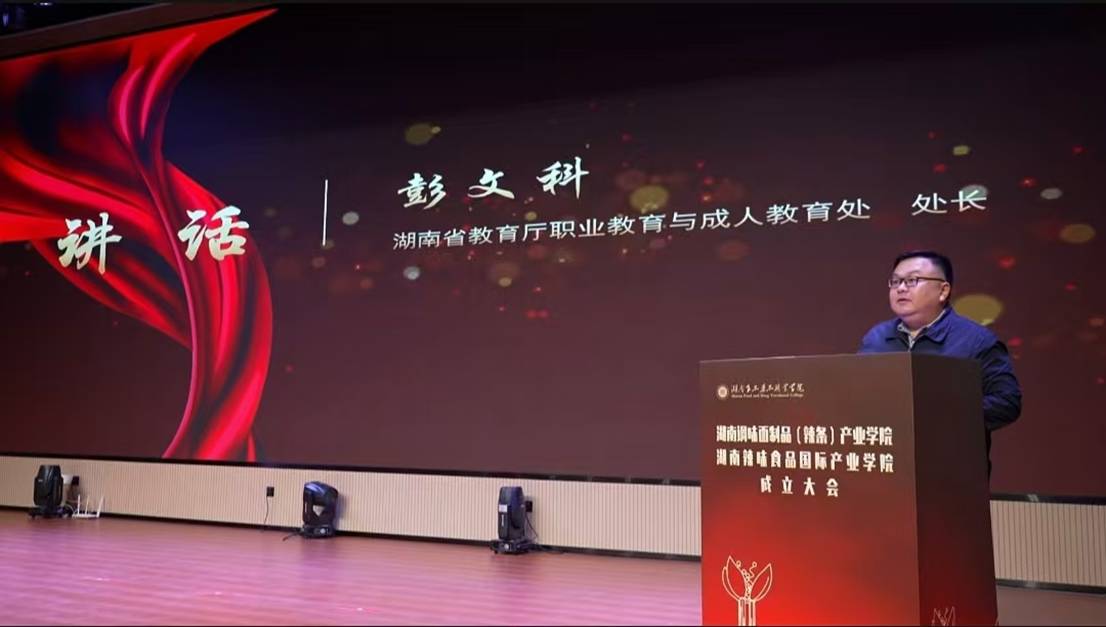 湖南省教育厅职业教育与成人教育处处长彭文科在讲话中说:湖南辣味食品国际产业学院、湖南调味面制品(辣条)产业学院的正式揭牌成立。这是我省职业教育深化产教融合、服务地方产业、践行随企出海的一件盛事,也是推动职业教育适应性发展,增强服务湖南现代化产业体系能力的重要举措。希望各成员单位立足国家战略,深化校企协同,产业学院的成立,是新征程的起点。希望湖南食品药品职业学院能以此次揭牌为契机,牢牢把握高质量发展这个首要任务,大胆探索,锐意创新,与行业企业通力合作,将产业学院建设成为湖南职业教育的“金名片”和地方特色产业发展的“加速器”,为奋力谱写中国式现代化湖南篇章作出新的、更大的贡献!