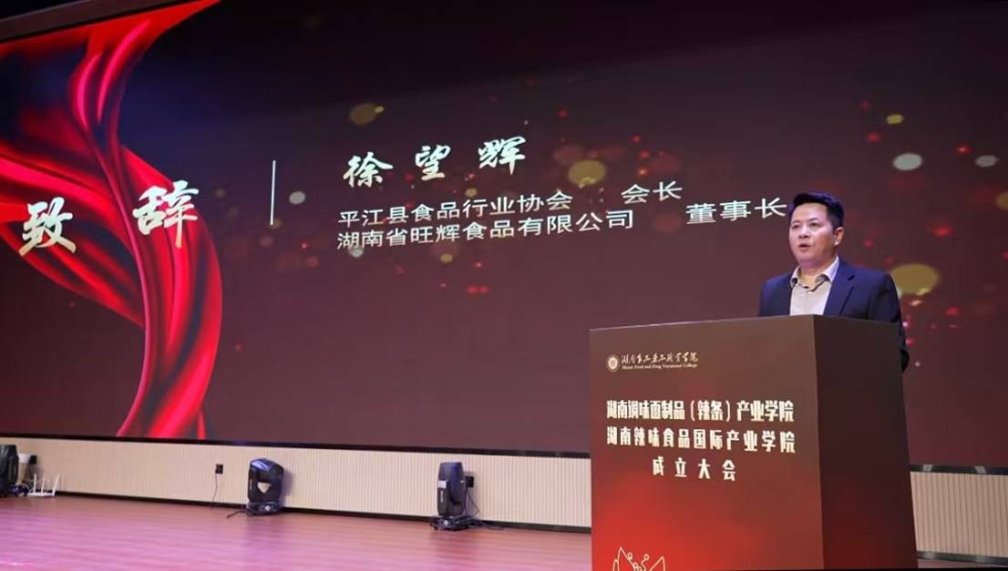 平江县食品行业协会会长、湖南省旺辉食品有限公司董事长徐望辉致辞时提到,平江辣味食品产业从地方小作坊成长为千亿级赛道,离不开政校企的同心聚力。他承诺,龙头企业将以产业学院为纽带,开放生产车间、共享市场资源,把产品创新、品质管控与国际市场开拓的实践经验转化为教学资源,助力培养既懂技术又通市场的复合型人才,推动产业从“规模扩张”向“质量提升”跨越。