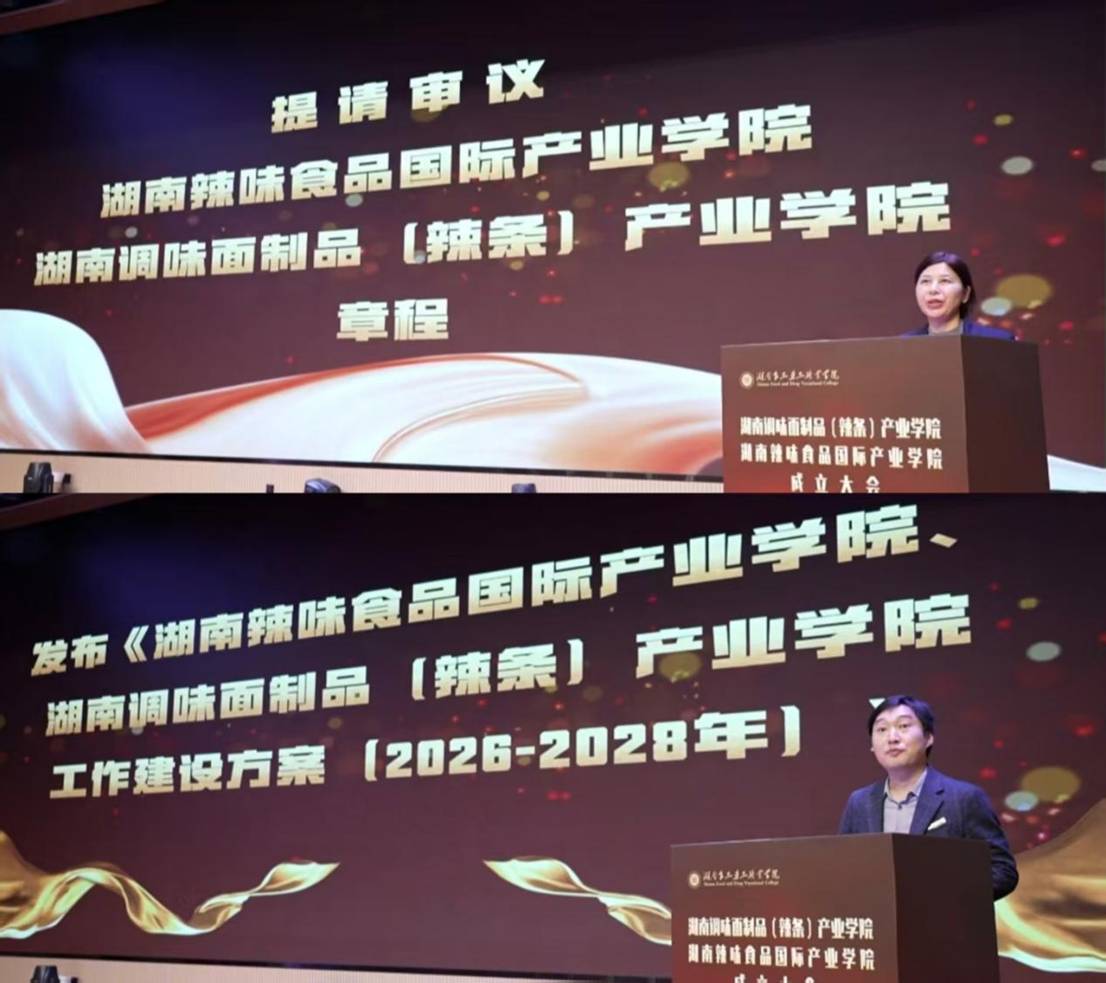 大会还完成了多项重要议程:全体代表审议并一致通过《湖南辣味食品国际产业学院、湖南调味面制品(辣条)产业学院章程》,《章程》明确了产业学院的组织架构、运行机制与发展目标;现场发布《湖南辣味食品国际产业学院、湖南调味面制品(辣条)产业学院工作建设方案(2026-2028年)》,从人才培养、技术研发、国际合作等方面绘就未来三年发展蓝图。