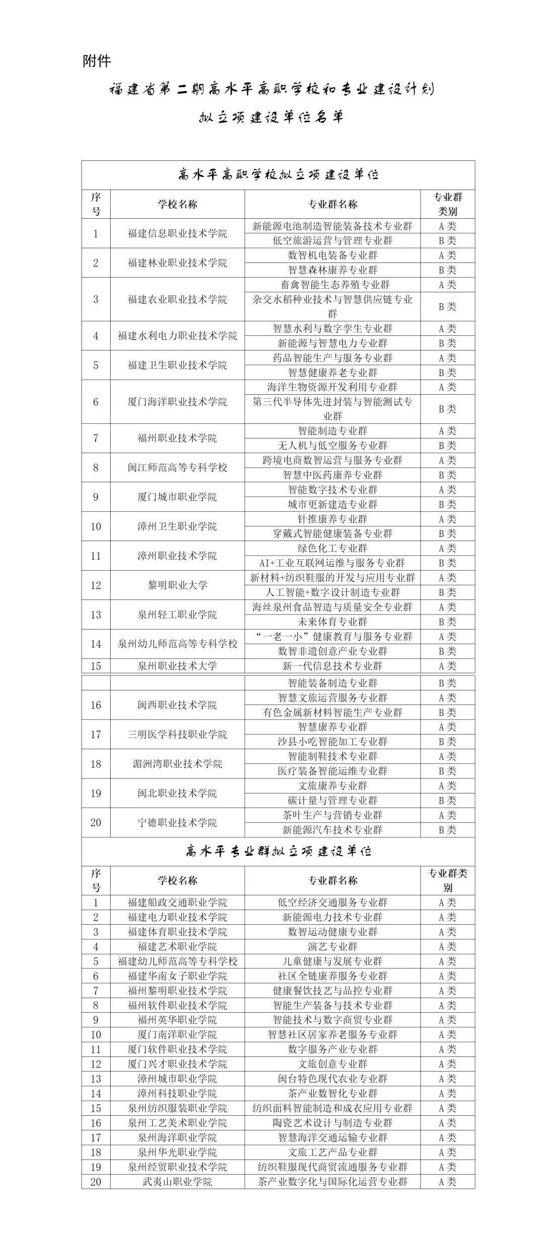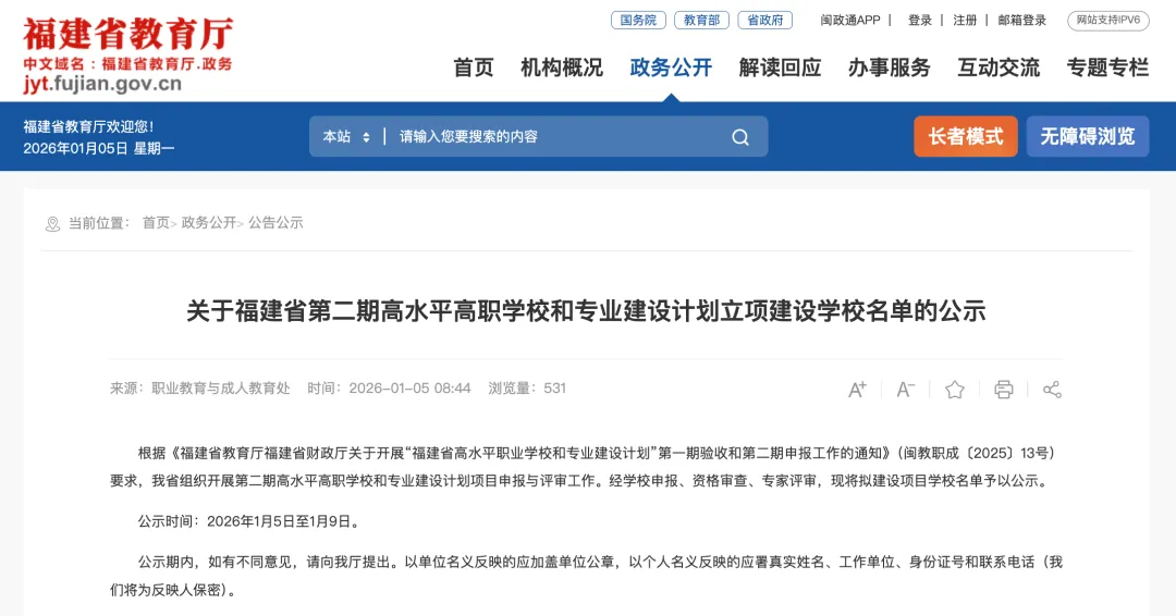 根据《福建省教育厅福建省财政厅关于开展“福建省高水平职业学校和专业建设计划”第一期验收和第二期申报工作的通知》(闽教职成〔2025〕13号)要求,我省组织开展第二期高水平高职学校和专业建设计划项目申报与评审工作。经学校申报、资格审查、专家评审,现将拟建设项目学校名单予以公示。公示时间:2026年1月5日至1月9日。根据公示名单,20所高校入选高水平高职学校拟立项建设单位,20所高校入选高水平专业群拟立项建设单位。