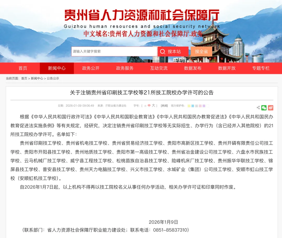 1月9日,贵州省人力资源社会保障厅发布《关于注销贵州省印刷技工学校等21所技工院校办学许可的公告》。