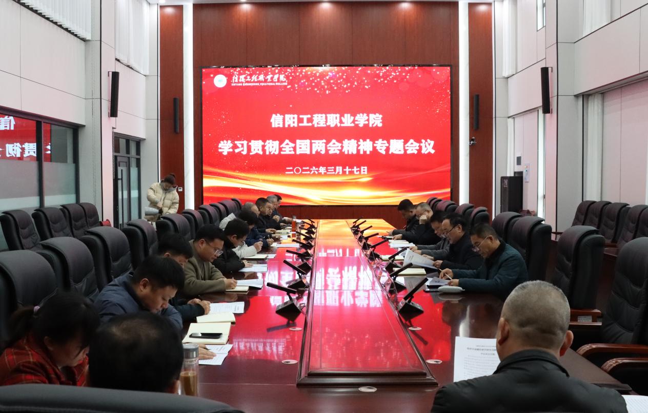 3月17日上午,信阳工程职业学院学习贯彻全国两会精神专题会议在炎培楼七楼大会议室召开。会议深入学习领会习近平总书记在全国两会期间的重要讲话精神及全国两会精神,全面部署全校贯彻落实工作。学校党委书记吴海涛主持会议并作总结讲话,党委副书记、校长黄功学,党委副书记许松,副校长杨金国、徐俊杰及全体中层干部参会。